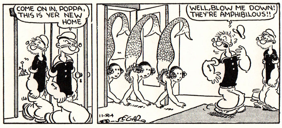 E.C. Segar is one of the few comic pioneers whose signature series is still iconic among general audiences. 'Thimble Theatre' is the fourth longest-running comic series of all time, behind Rudolph Dirks' 'Katzenjammer Kids' (1897-2006), Frank King's 'Gasoline Alley' (1918- ) and Billy DeBeck's 'Barney Google and Snuffy Smith' (1919- ). It's third in line as the longest-running uninterrupted newspaper comic series. Of these strips, Popeye is arguably the longest-lasting and had the most global cultural impact. Generations of children have been told to eat their spinach in order to get as strong as Popeye. Millions actually did too. The Allen Canning Company sold spinach with 'Popeye' as their brand name. Wimpy lent his name to fast food chain Wimpy's (1934) and Wimpy's Seafood Restaurant (1938) on Cape Cod, MA. Wimpy was also the nickname of the Vickers Wellington bombers - or "Wimpies". During World War II, the name of the type all-terrain vehicle "jeep" was inspired by Eugene the Jeep. Many marine forces on the Allied side also used Popeye as their mascot. It has sometimes been stated that Segar invented the word "goon"; which isn't true. But he did popularize it in the English language as a way of referring to thugs or brutish cronies. And the word was the direct inspiration for the legendary British comedy team, the Goons. In Japan, the fashion and lifestyle magazines Popeye (1976), Brutus (1980) and Casa Brutus (2000) were all named after Segar's characters. Novelist William Faulkner named a character in his novel 'Sanctuary' (1931) Popeye, and Gene Hackman played a policeman named Popeye Doyle in the classic film 'The French Connection' (1971).