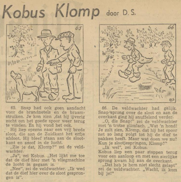 On 4 August 1947, 'Van Bergen' returned to the pages of the Nieuwe Provinciale Groninger Courant with a new series of adventures. Appearing with intervals, these new episodes ran until 25 May 1955. In between, Sikkema created a couple of other comic features, starring clog-wearing countryside characters like 'Pieterboer' (3 July-3 September 1947) and 'Kobus Klomp' (4 November 1947 - 27 January 1948 and 15 October -12 December 1949). Between 23 January 1953 and 5 February 1954, he serialized several stories with the two hunters 'Appie en Bertus' and in the period 1950-1955 many stories with the nobleman 'Baron De Bruin', with the final story concluding on 28 April 1955.