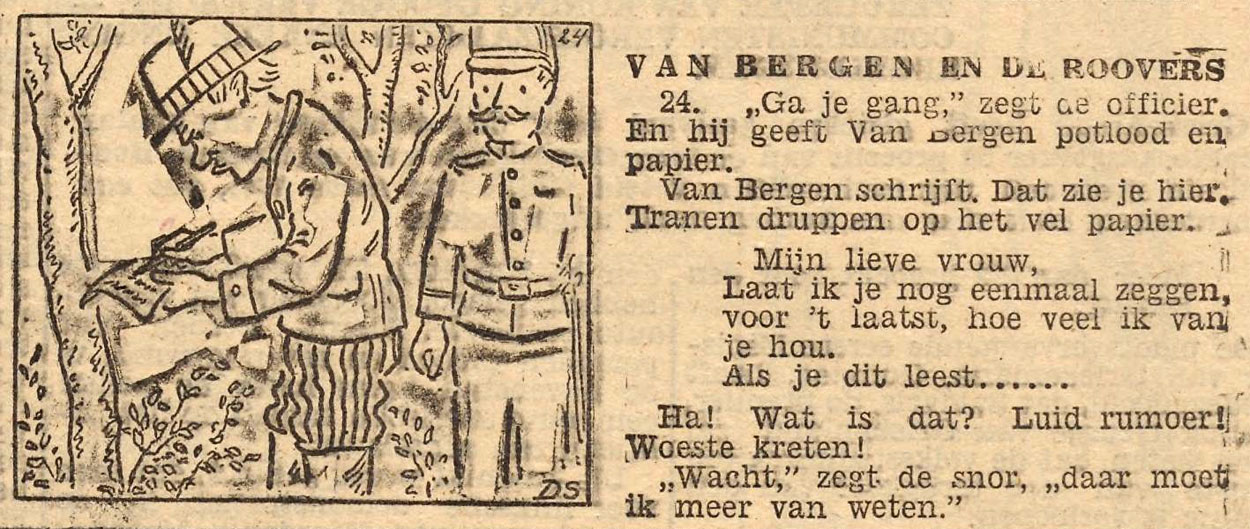 Starting on 6 February 1946, the Nieuwe Provinciale Groninger Courant ran several stories with the adventures of mister 'Van Bergen', published with one or two panels a day and with text captions in rhyme. In the debut episode, the title character leaves his wife to go out hunting. It wasn't until 26 February 1947 before he returned home, having experienced all sorts of weird and funny adventures. Some feature everyday situations, like Van Bergen having a toothache, going out fishing and losing his hat. Other stories are more adventurous, when Van Bergen gets in trouble with a group of robbers, or when he tries to build an airplane. Since the narrative appeared in a devout Christian newspaper, the stories were family-friendly, although Sikkema didn't shy away from having his hero almost be hanged by the robbers, who in turn were killed during a shootout. In 1946 and 1947, the newspaper's Groningen publisher Jan Haan released six booklets with Van Bergen's adventures.