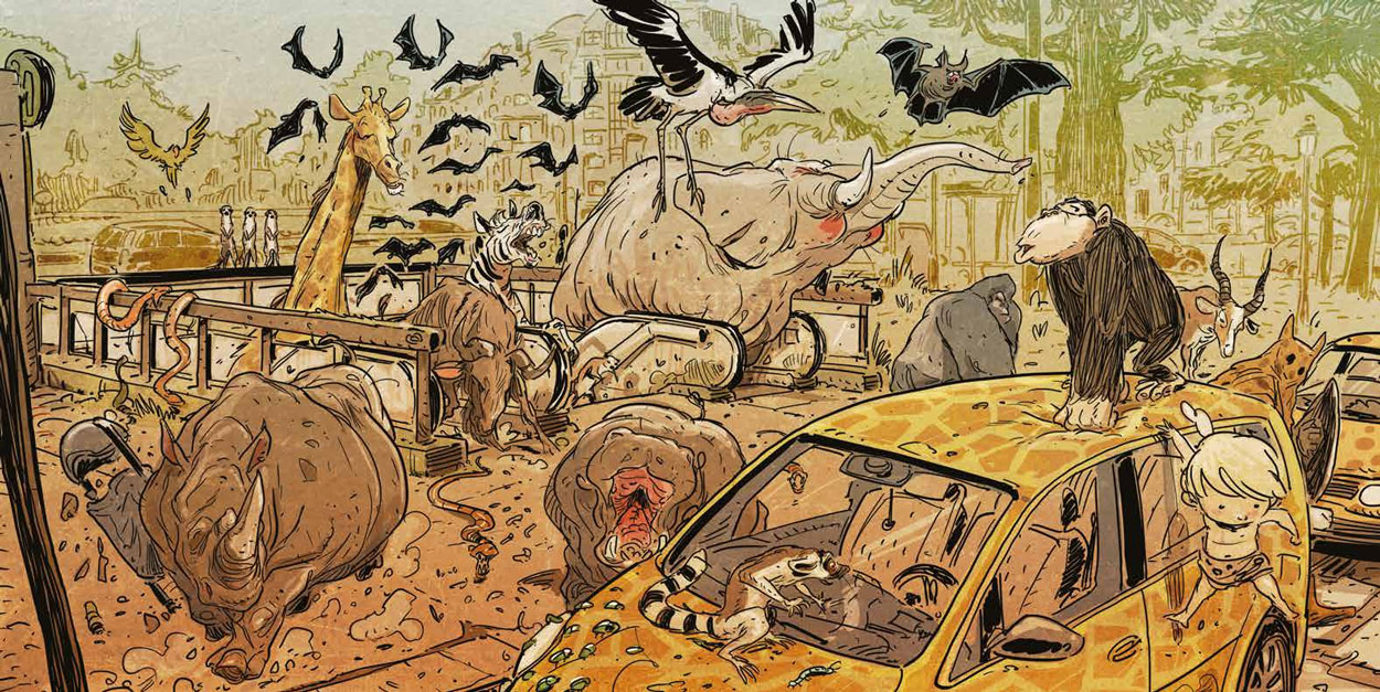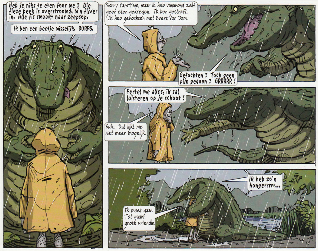 In 2005, Stedho created his first genuine solo comic book, 'Ooievarken' (Bee Dee, 2006). This experimental pantomime comic centers around four characters who all live separately from one another. One is a stork, another a space pilot, yet another a young woman who lives on a farm in the desert and the final character a mysterious animal who resembles an aardvark. Installments first appeared in the magazine INK and on the Pulp de Luxe portal. Other personal comic experiments by Stedho were published in the early issues of P@per, the comics supplement of Brabant Strip Magazine.