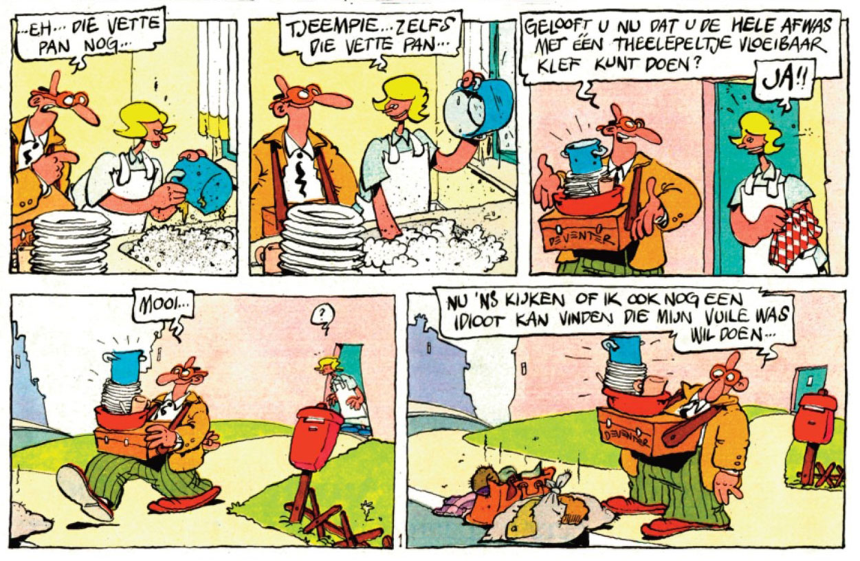 Through their work for De Vrije Balloen, the Prutswerk team was also introduced to more mainstream magazines. Starting in 1978, their comics appeared in the Malmberg children's magazines, which were distributed at schools. In Taptoe, they co-created the Sherlock Holmes spoof 'Sulle Hooms' (1978-1982), scripted by Patty Klein. In each episode, the brilliant detective presents the reader with a puzzle or whodunit tale, of which the solution could be found in the same issue, a few pages later. The series was quite a challenge, since the team had to come up with a weekly puzzle, present it in a narrative and top it off with a funny punchline. Taptoe's 1983-1984 volume introduced a new Prutswerk creation, starring the unlucky garbage man 'Bert J. Prulleman' (1983-1984). This was however largely a Stevenhagen solo production, as the Prutswerk partnership had broken up by then. The series spawned three albums, published by Espee. In the late 1970s, the Prutwerk team also provided artwork to Malmberg's pre-school magazine Primo.