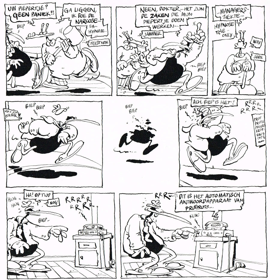 Prutswerk's first recurring comic character originated from one of their 'Twee Voor Twaalf' animations. For a segment about the Tower of London, they created an anthropomorphic raven, who later developed into their anthropomorphic investigator 'Prut Pruts Private Kreye' (1976-1983). In the comic, Prut Pruts is a cross between a raven and a crow, and the feature's pun-based name referred to the word "private eye" and "kraai", the Dutch word for "crow". During its first year, the comic ran in the Amsterdam neighborhood newspaper Buurtkrant Hugo de Groot, but it quickly moved to De Vrije Balloen. There, the duo expanded their strip with a full-fledged funny animal cast, with Prut Pruts working in all kinds of professions, but often returning to sleuthing. The 'Prut Pruts' strip appeared in De Vrije Balloen until its 47th and final issue in 1982. The character then reappeared in the magazine's short-lived follow-up De Balloen, published by Prutswerk's publisher and agent Ger van Wulften. By then, the comic had become largely a Stevenhagen solo project, and from issue #57 (1983) on, it was exclusively written and drawn by Stevenhagen.