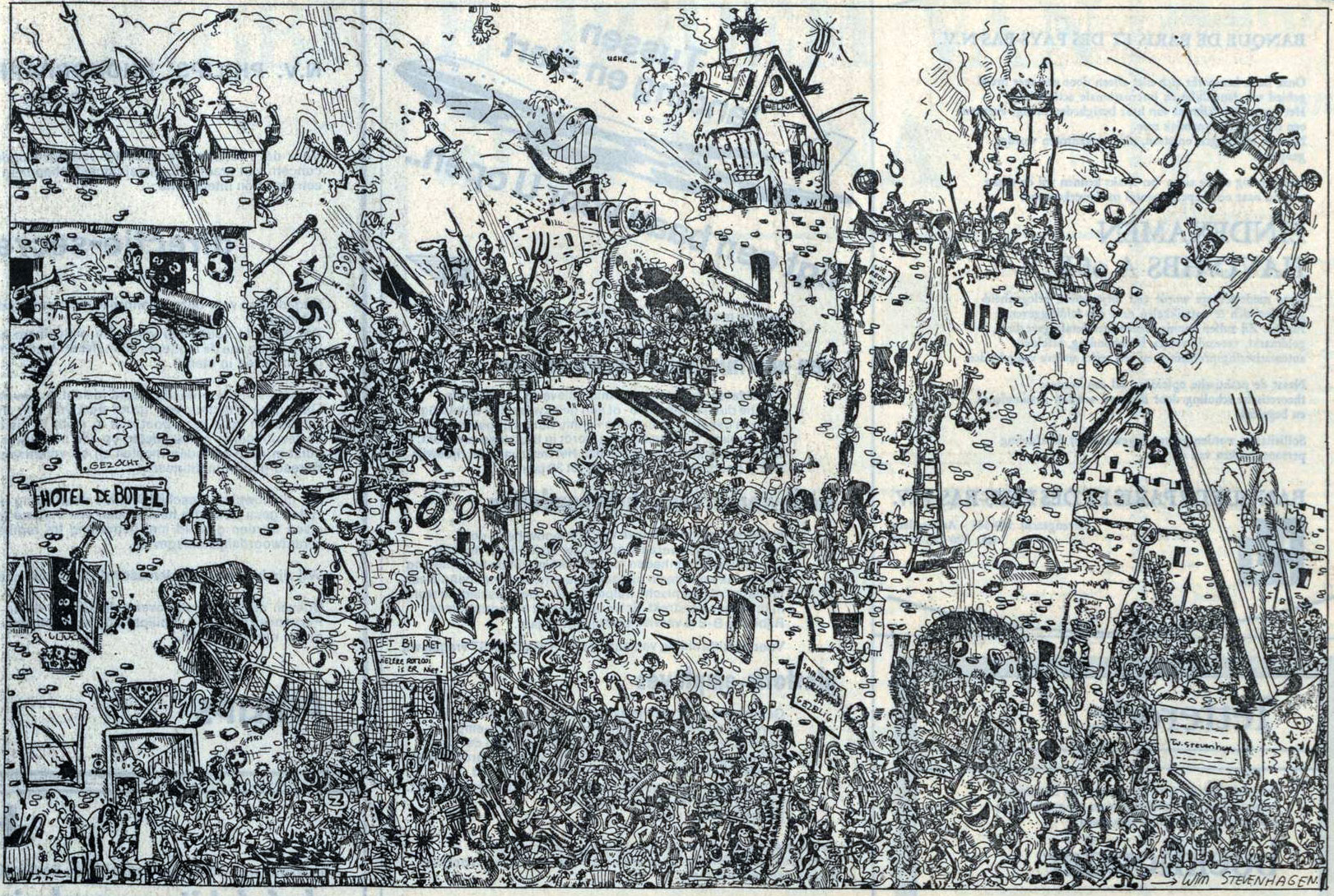 During his Prutswerk years, Stevenhagen had already been making solo cartoons and illustrations for Alerta, a magazine about the political and social issues in Latin-America, and also for the Association for Conscientious Objectors. A man of principles and social engagement, Stevenhagen indeed refused to fulfill his military service. When this resulted in imprisonment, it prompted fellow comic creators Patty Klein and Willy Lohmann to initiate a collective protest comic book in support of their colleague. The 1985 anthology 'Tegenaanval' (De Lijn, 1985) contained old and new material by Dutch cartoonists like Lohmann, Fritz Behrendt, IJf Blokker, Corver, Arend van Dam, Baldi Dekker, Loek van Delden, Frankie, Tom Hageman, Elly Holzhaus, Rudy Hulleman, Coen de Jong, Fred Julsing, Koedam, Raymond Koot (better known as Typex), Nel van Beek-Van KotenPiet Kroon, Fred MarschallMarvano, Lex van de Oudeweetering, René, Scheepers-Hendriks, Peter de Smet, Jan Steeman, Peter van Straaten, Studio Visioen, Fred ThieBerend Vonk and De Wit. Belgian contributions came from André Franquin, Gal (Gerard Alsteens), Ronald Grandpey, Ploeg, Jef Wellens, Yaack and Yurg