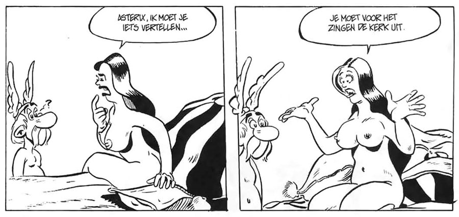 During their association with Espee, De Jager and Stevenhagen also participated in group projects. Together, they wrote the script for 'Rammérix, Le Condôme', a porn parody of René Goscinny and Albert Uderzo's 'Astérix'. Published anonymously by Espee in 1982, the book was part of the 1980s wave of sex parodies with famous comic heroes. In the spoof, the Gauls discover they are out of condoms, inspiring Asterix and Obelix (here named Rammérix and Onanix) to travel to Rome to get new ones. On their trip, they have various sexual escapades, visit a Chinese restaurant in Lutetia and cause mayhem at the Lourdes pilgrimage site. However, Onanix isn't allowed to have sex, because he fell into the cauldron when he was young. This doesn't prevent him from having menhir-sized erections. The parody also featured a lot of meta humor, for instance when the characters complain about the nonsensical plot and "lack of enough sex scenes". 'Rammérix' is sometimes confused with two other 1982 'Asterix' porn spoofs, namely 'Asterix de Geilaard' and 'Asterix op de Walletjes' (both by De Bokken, 1982), signed by AVE. Out of fear of legal trouble, 'Rammérix' was produced in secret, even without using a pseudonym. The first page was drawn by Bert Tier, who then passed the pencil to Willem Vleeschouwer and Stevenhagen to finish the rest of the story. Aad Labadie was possibly also a contributor to the book. The book was released by Espee in collaboration with a "prestigious Dutch publisher who wanted to remain anonymous." After half of the books had been sold, the publisher suddenly changed his mind and destroyed the rest of the stock.