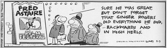 'Frank and Ernest' also originated a very famous quote about iconic Hollywood actress and dancer Ginger Rogers, best-known as Fred Astaire's most frequent dance partner. On 3 May 1982, Thaves drew his characters while they observed a poster for a Fred Astaire film festival. A woman says: "Sure, he [Fred Astaire] was great, but don't forget that Ginger Rogers did everything he did... backwards and in high heels." This observation has frequently been quoted in numerous articles, books and documentaries about Rogers, often without crediting Thaves. As a result, many people have no idea that the quote originated from a comic strip. When the Hollywood icon died in 1995, the quotation was already famous enough to be featured in newspaper obituaries of Ginger Rogers all over the world.