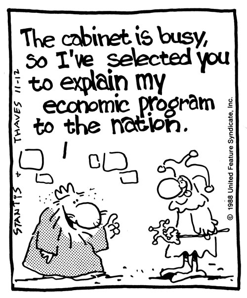 With Scott Stantis as scriptwriter, Bob Thaves created a second newspaper cartoon, 'King Baloo' (23 May 1988 - 16 April 1989). Unlike 'Frank and Ernest', it was a more traditional gag-a-day comic. Set in the Middle Ages, the single-panel gags revolve around a monarch, Baloo, his family and his people. Despite the historical time frame, the comedy was deliberately anachronistic, with frequent nods to 20th-century society and culture. However, 'King Baloo' didn't catch on and was discontinued even before the end of Thaves' and Stantis' contract with the United Media syndicate.