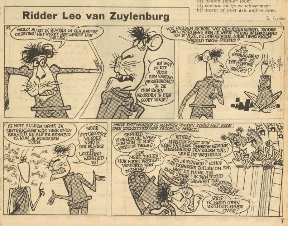 Between 1959 and at least 1961, Thé and scriptwriter Lo Hartog van Banda also made a weekly children's comic strip for Vrije Geluiden, the magazine of broadcasting corporation VPRO. The funny animal strip took off on 28 November 1959 and starred 'Ridder Leo van Zuylenburg', a lion knight described as a "brave fighter against injustice" in the kingdom of Laegland ("Lowland", referring to the "Low Countries" to which the Netherlands belong). The feature started out as a typical text comic, with text and dialogues underneath the images, but on 10 December 1960 it changed to the more contemporary balloon comic format.