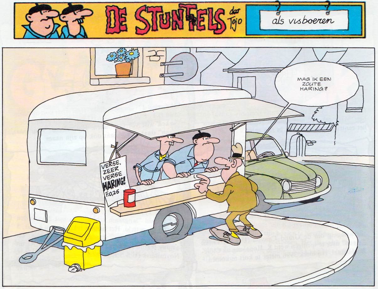 Perhaps the most productive comic artist of the Netherlands, Van Driel and his comics thrive by his unique, personal signature. Only on occasion has he worked with other artists, and not always with satisfying results. For Eppo magazine, he drew 'De Stuntels' ("The Bunglers", 1978-1979) in collaboration with comic artist Jan van Haasteren, signing the feature with the collective pseudonym "ToJo". Like the title implies, the "Stuntels" are two clumsy idiots, comparable to Laurel & Hardy. Each short story casts them in a different job, in which they always fail utterly. Van Haasteren later dismissed the strip, largely because of Van Driel's reckless inking over his pencil work. Despite this clash of styles, some new episodes appeared in Knudde magazine between 1981 and 1983. In 1985, Van Driel briefly revived the project in Eppo under the title 'De Sukkels' (1985-1986), this time with artist Bart Slijp. The final episodes were written by Patty Klein. For his assistant Ray Nicholson, AKA "Nick Ray", he wrote the gags of 'Familie Kijkgraag' (1984-1985), a comic appearing in the gossip magazine Weekend.