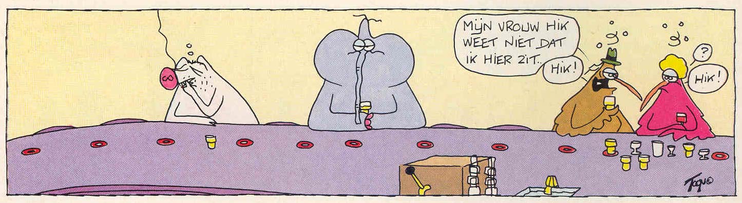 Following the popularity of 'F.C. Knudde', strips by Van Driel became in much demand. Newspaper Algemeen Dagblad was happy to give him additional space for a second daily gag strip. On 14 June 1980, his 'De Stamgasten' debuted in the paper, and weekly color installments of the feature later appeared in the magazines Eppo and Panorama too. Built around a simple but effective premise, the comic follows the drunken antics of a group of funny animal pubcrawlers. All episodes take place in "De Stam", a bar mostly situated in a tree trunk - the name being a pun on the Dutch expression "stamkroeg" for "favorite bar" and the Dutch word for tree trunk, "boomstam". Sometimes, however, this establishment can be found in other places, varying from the desert to the South Pole. Inside, its clients fill the room with idle chatter, drunken hook-ups and vulgar jokes. The bar keeper is a no-nonsense dog who frequently has to force his guests to pay for their drinks or go home when it's closing time.