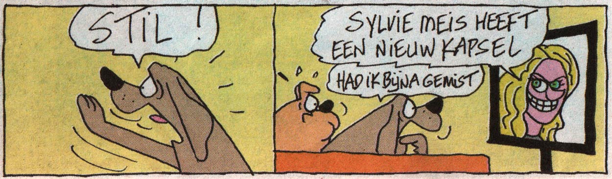 Not worried about these previous attempts in the slightest, Van Driel created his own graphic interpretation of the famous humorist, this time with actual involvement of Van Duin. Their version lasted a lot longer, although later in the run, during the 1990s, Van Driel shifted the focus from the comedian to his two dogs, Wibo and Van Gorp. In 1990, the Dutch TV station TROS broadcast the TV series 'Lach Mee met André', which compiled all of Van Duin's stage shows and TV appearances on their channel. The intro to each episode showed clips from these broadcasts, but also a gag page from Van Driel's comic strip. In 2023, publisher Cliché published the first volume of the complete re-edition of Van Driel's 'André van Duin' comics.