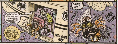 Born in Istanbul, Cengiz Üstün graduated from the Faculty of Fine Arts from Mimar Sinan University. He published his first cartoons in magazines like Çarşaf and Horoz. He later contributed to Pişmiş Kelle, Avni and Dıgıl, where he started his popular satirical series 'Duka Film'. One of his best known creations is 'Kunteper Canavarı', a serial that appeared in both L-Manyak and Lombak.