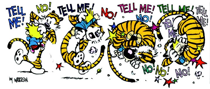 Whether Hobbes is real or not has always remained an open question. Many gags suggest that he is merely the product of Calvin's imagination. The kid is usually alone when he talks to Hobbes. Nobody but him ever acknowledges that the tiger is alive. Even other children just see him as a toy. However, other gags hint at the fact that Hobbes could be real. Adults sometimes find him in places where Calvin couldn't possibly have brought him on his own. Also, Hobbes often acts as the voice of reason. He is far more mature, clever, articulate and down to earth than Calvin, almost acting like a surrogate parent. It seems strange that Calvin would be able to imagine all this, given his age. It might be that Hobbes merely turns into an inanimate object whenever other people enter his vicinity. Watterson deliberately left everything vague. He once stated that this was the reason why he never wanted to make a movie or TV adaptation of the series, because he would have to make a permanent decision about it.
