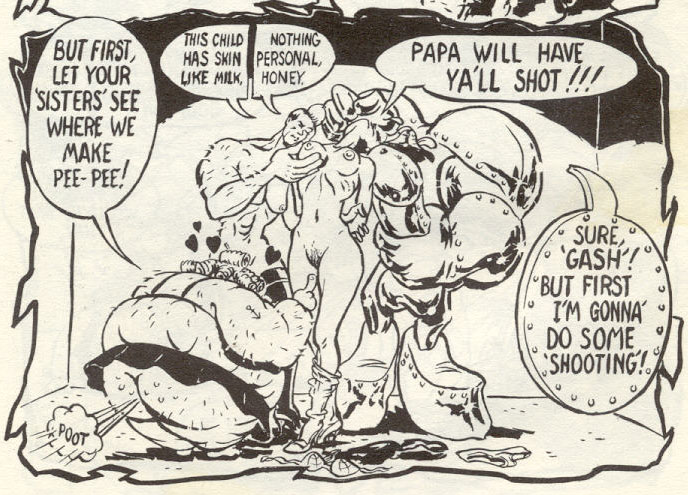 In the second half of the 1960s, Williams' interest was sparked by another attractive subculture: underground comix. Zap Comix by Robert Crumb blew his mind the same way Mad Magazine did. He quickly joined the underground movement and contributed comics to Gothic Blimp Works, Felch Comics, Coochy Cooty Men's Comics, Snatch Comics, Snatch Cumics, Tales from the Tube and naturally Zap Comix itself from the late 1960s through the 1970s and 1980s. His signature series was 'Coochy Cooty' (1969), which featured an insect-like creature drawn in the style of a 1930s cartoon character by Walt Disney or Max and Dave Fleischer. In Williams' comics, though, all innocence is gone. Coochy Cooty is an anti-hero who lives in a depraved world full of sex and drugs. The character appeared in various underground titles, but also featured in one stand-alone comic book: 'Coochy Cooty Men's Comics' (1970), published by The Print Mint Inc. The adventure has Coochy fighting against a bunch of women who are half gorilla, half Nazi.