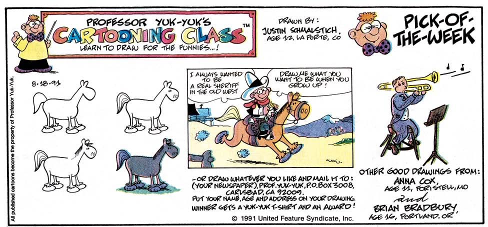 Later-day creations by Wejp-Olsen were five illustrated children's books of 'Nikolajs hemmelige liv' (Gyldendal AV, 1982, reprinted by Lindhardt og Ringhof), about the adventures of a little boy and his dog Todenskiold. 'Wowsekøbing' (1985) was a funny animal comic about a city with anthropomorphic dogs, published in book format by Forlaget Casa Aps, and also ran in the Swedish newspaper Svenska Dagbladet as 'Jyckeby'. Werner Wejp-Olsen moved to Massachusetts in the USA, where he continued to work on his many creations. 'Professor Yuk-Yuk's Cartooning Class' was syndicated by United Features from 4 February 1990 until 26 June 1994. His new creation 'TRENDZ' (1995) poked satirical fun at everyday issues like cellular phones, fashion, cars, TV, organic food and UFOs. It debuted in Denmark in Jyllands-Posten, and was quickly published all over Scandinavia and eventually also in the USA.