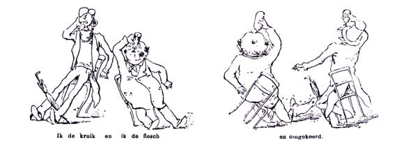 This period was also marked by the emergence of many humorous and satirical magazines. One of the most important was Het Humoristisch Album, started in 1856. Many illustrators, such as Jan Linse (1843-1906) and J. Holswilder (1850-1890) contributed to this magazine. In 1866, it published a Dutch version of the famous story of 'Monsieur Cryptogame', originally by Rudolf Töpffer (without crediting him). In translation, this was 'Meneer Spillebeen' or 'Meneer Prikkebeen'.