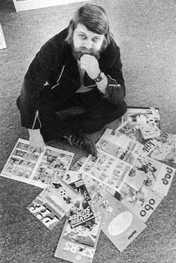 Redactie Pep in 1973, door Willy Lohmann. Vanaf linksboven, tegen de klok in: een schoonmaakster, Jan de Rooij, Cees de Groot, Frits van der Heide, een tekenaar, Jan van Erp, Maarten Boom (op poster), Anneke van Wissen, een secretaresse en Frans Buissink (staand)