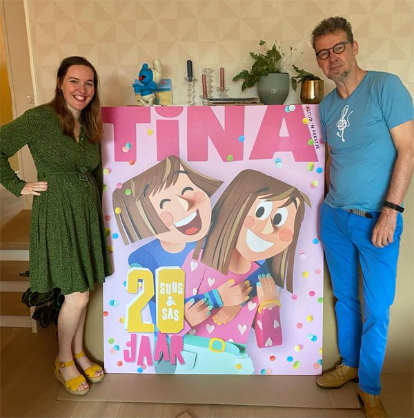 Toen Suus en Sas in 2021 twintig jaar in Tina stonden, werd een speciale Tina gemaakt om dit te vieren. De redactie verraste de maker Gerard Leever (rechts) met een iets te groot uitgvallen blow-up van de cover, die weer een vouwkunstwerk van dochter Lonneke Leever (links) bevatte.