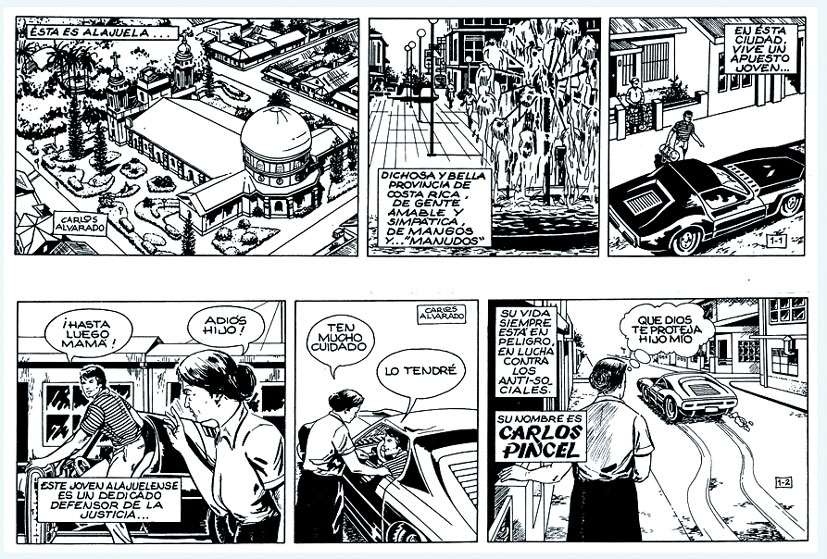 He was born in Alajuela in 1958 as Carlos Enrique Alvarado Salazar and had no formal art training. At age 17, he created his character 'Carlos Pincel' (1975), whose adventures appeared in the now-defunct newspaper Excelsior. The main star was a stylish detective, who tore through Costa Rica's bucolic streets in his brand new Ferrari, resolving audacious police and espionage matters. The strip is notable because it was the first comic strip in a Costa Rican newspaper without a satirical or political undertone. 'Carlos Pincel' therefore strongly deviates from the work of the country's major cartoonists of the time, Fernando Zeledón Guzmán and Hugo Díaz Jiménez, but still the hero's adventures didn't last long. When the paper went out of business three years later, it was continued for a short period in Diario Extra. After this collaboration ended, Alvarado could not get his strip printed elsewhere, and the comic was shelved. The nickname Pincel, however, stuck to the artist ever since.