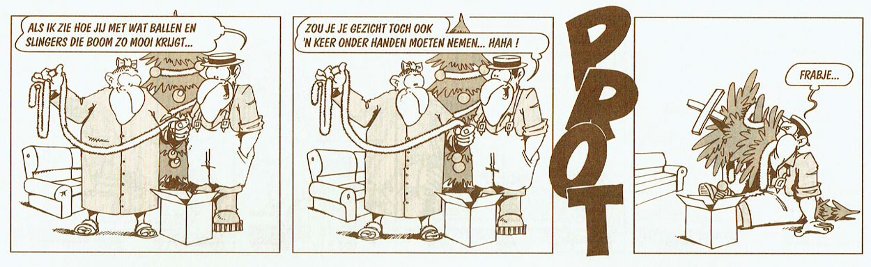'Bèr Bizaar' is a big-nosed man in overalls who, as his name implies, acts bizarre or finds himself in bizarre situations. Some gags have his wife as a side character, other a strange, turnip-like creature. The gag comic ran in 1998-2000 in Groot Weekblad Lommel, a weekly distributed in the Flemish village Lommel in the province Limburg. In 2000 a landscape format compilation booklet, 'Bèr Bizaar. Altijd Te Laat Is Ook Een Regelmaat' was published by L'Ombelico Production, in cooperation with this magazine.