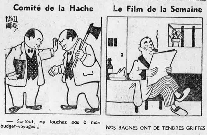 Political cartoons for Le Face à Main (22 November 1947). The men in the first panel are caricatures of Belgian Prime Minister Paul Henri Spaak, planning to "axe his travel budgets".