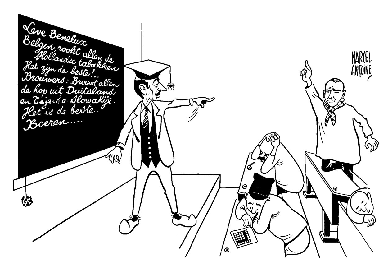 Cartoon for the 1954 Belgian elections. CVP/PSC Minister of Agriculture Charles Héger stands in front of the class and lectures his party colleague Georges Feryn, senator and farmer in Proven. The caption said: "CVP Minister-hop planter Héger teaches a lesson: Shut up, Feryn, and just sit down… You don't understand a thing about hops. Learn your lesson from Benelux. You know: for us the legs ["benen" in Dutch] and for them the Luxury…".