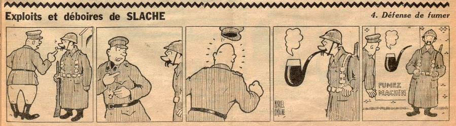 In 'Le Grand Voyage de Slache', Slache and his sidekick Olive try to retrieve an umbrella containing a precious stone. Their adventure leads them to a voyage all over the world. The stories and artwork are credited to Marcel Antoine himself. The adventures of Slache ran in Spirou until issue #8 of 1941 (20 February). In 1942, the Nazis banned Spirou, but after the Liberation, the magazine made its triumphant return. Between issue #1 (4 January 1945) and 10 (29 March 1945), Marcel Antoine returned to its pages, this time as the author of a column, 'Vie du Monde' ("Life of the World").