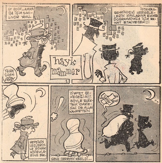 In 1956, Oğuz Aral launched his first notable comic series. The 'Hayk Mammer' (1956) was a parody of Mickey Spillane's popular no-nonsense P.I. Mike Hammer, and the first serial debuted in İlhan and Turhan Selçuk's humor magazine Dolmuş. That same year however, it transferred with its author to the daily newspaper Yeni Sabah ("New Morning"). Three years later, another one of Oğuz Aral's long-lasting comic characters debuted, the carefree loafer 'Utanmaz Adam' (literally, "the Shameless Man"). Several of his adventures were collected in a comic album published by Heybe in 1964. During the 1960s, Aral was a regular contributor of illustrations and comic strips to Pazar, the weekly supplement of the newspaper Akşam. The magazine also introduced Aral's third regular comic character, the scruffy vagabond 'Köstebek Hüsnü' ("Hüsnü the Mole"). The feature was later continued for many years in Aral's own magazine Gırgır.