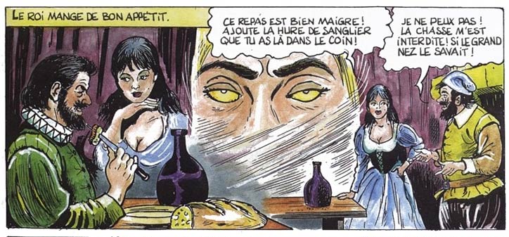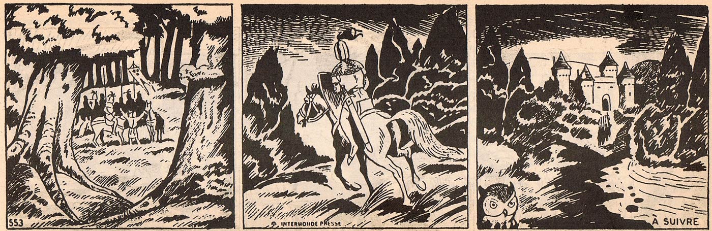 Arbeau also worked on several horizontal and vertical strips for newspapers, for which he assumed a semi-realistic drawing style. He made vertical strips of an educational nature with writer Edith Hare for the Presse-Service-Magazine, and a great many adaptations of novels for the agencies Intermonde Presse and Mondial Presse. These included features in Paris-Jour ('Accusé, Levez-Vous!', 'Colomba', 'L'Horloger du Diable') and Franc-Tireur ('Truand et Gentilhomme' with Yves Dermèze in 1956). One of his most notable works of this period was the Arthurian serial 'Le Roman de la Table Ronde', which he made with writer François Gratier for Intermonde Press in 1966. It was published in 630 strips in regional papers through Intermonde Presse, including Le Républicain Lorrain, Nord Eclair, L'Espoir, Le Progrès, Le Midi Libre, Nord-Matin and L'Espoir de Nice.