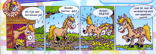 'Charlie', from Penny magazine. Translation: "Ah, time for a new coat! Mud! Splish, splash! Mud! Splash! Isn't that fun, having appaloosa fur for a chance?"