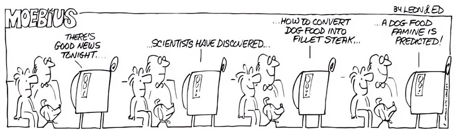 Another gag comic by Asprey's was 'Moebius', made in collaboration with American physicist Edgar Edelsack. It stars the absent-minded professor Cranius, Robert the dog and Moebius, a character who originated from a Möbius strip (the scientific concept, not the Moebius moniker of Jean Giraud). Asprey also created the gag comic 'Wheel Nuts', starring anthropomorphic cars, and 'Only Human', an one-panel gag cartoon series about people in everyday embarrassing situations. Asprey is additionally the man behind the cute puppy dog 'Pooch' and the romantic one-panel cartoons 'Bee Lines'. He also created the comic 'Freida and Freddy', about a cat and a dog. The pets became mascots for Football for Friendship, an international organization that brings children, worldwide, together through football.