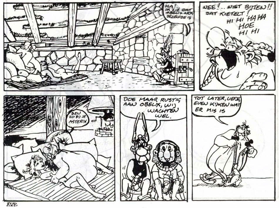 Released under the spoof imprint Uitgeverij De Bokken, 'Asterix de Geilaard' was the first sex parody of Albert Uderzo and René Goscinny's famous Gaul signed by the mysterious "AVE" (the Latin word for "salute"). The plot is loosely based on the official 'Asterix and Cleopatra' album, but otherwise follows a loose narrative. Instead of Caesar and Cleopatra betting whether the Egyptians can still build temples, they bet which of their sex slaves is "the best". Shortly afterwards, Asterix and Obelix find a raped female in the forest, who with her last breath claims she and her daughter were violated by the Romans. Her daughter is apparently still alive and kidnapped. The plot then lies dormant for several pages, as the reader is treated to an extensive sequence in which the wife of village elder Geriatrix has sex with several of the other Gauls. Eventually, Asterix, Obelix and Getafix the druid travel to Egypt, where Getafix has sex with Cleopatra and consults the Sphinx to find out "who will win the bet". In the end, a previously unmentioned girl, Vaginella, wins and becomes ruler of the Roman Empire. The rambling tale concludes with Asterix informing the reader in a monologue that after Vaginella abdicated, Caesar became ruler again and everything went back to normal. The rest of the book is filled with one-panel cartoons of random sex scenes.