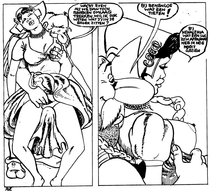 Within the same year as 'Asterix de Geilaard', a second AVE-created sex parody was published: 'Asterix op de Walletjes' (De Bokken, 1982), with the title referring to the Amsterdam Red Light District. Like the previous spoof, the book has a thin plot, off-model drawings and crude hand lettering. The story kicks off with village smith Fulliautomatix having an extramarital affair. Other Gauls join in the orgy until their wives find out. They decide to live separately from their husbands, motivating Asterix and Obelix to go out and find new wives for everybody. Their journey brings them to the Netherlands, where a pimp offers them the sexual services of his sister. A lengthy sex scene ensues, after which Asterix and Obelix go to the city to amuse themselves in a brothel. Satisfied with the service, they travel back to their village, bringing the prostitutes with them. However, by then the Gaulish wives have decided to reunite with their husbands, making the imported whores "useless". All ends "well", when the Gauls decide to pimp out their sex workers to the Roman army. AVE concludes the book with a statement for the readers, pointing out that it's remarkable that the Dutch press never gives any attention to comics, unless it's about sex: "How great that people get excited again about sex."