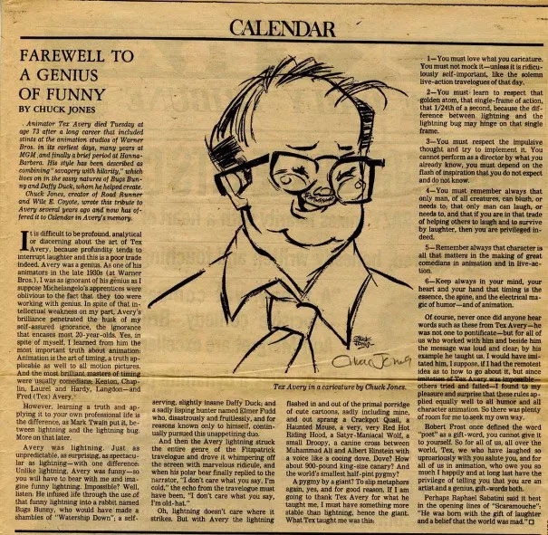 In memoriam to Tex Avery by Chuck Jones in 1980 (L.A. Times).