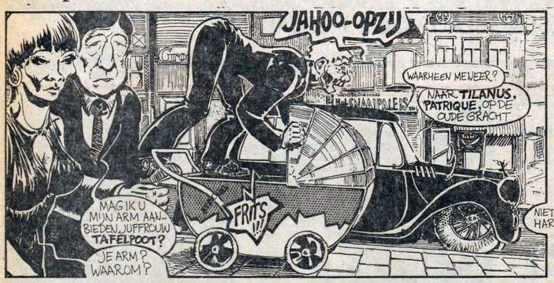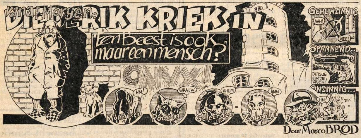 After his graduation, Bakker became a lay-out editor for the newspaper De Waarheid, an occupation he held until 1984. During this period, Bakker also created four comic serials for the newspaper, using the pen name Marco Brød. Strongly inspired by the anarchism and absurdism of underground comix, Brød's comics featured the subversive couple Frits Snars and Truus Tafelpoot. Replacing 'De wonderlijke avonturen van Jacob Maneschijn en Sientje Zeester' by Willem Wilmink and Willem Vleeschouwer, Marco Brød's first serial took off on 27 December 1978 and ran for 100 episodes until 24 April 1979. In 'Tafelpoot & Snars in "Hoofdzaken"', the rebellious student Frits gets involved in a crime scheme about stolen jewels and a talking head. The same characters returned in the next serial, 'Een Beest is Ook Maar Een Mensch?' ("An Animal Is Only Human", 16 January 1980 - 25 April 1980), in which - according to the description - an average guy called Diederik Kriek gets entangled in an adventure with monks, cats, mad scientists, businessmen and detectives. In the follow-up 'Poezeman in Therapie' (4 February 1981 - 5 June 1981), Frits Snars is mutated into a "Catman" by a mad scientist, and the fourth and final story, 'Pizza & Apekool' (12 January through 8 February 1982), deals with a mystery about a secret pizza recipe.