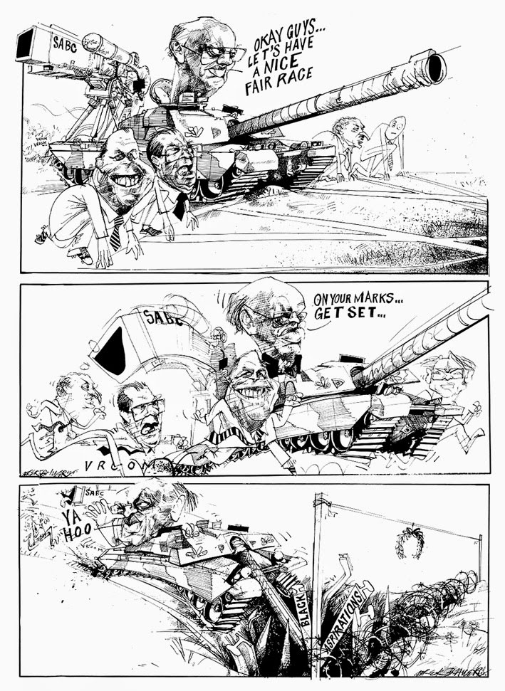 In October 1985, Bauer approached the newly founded newspaper The Weekly Mail in Johannesburg with his portfolio of drawings. He remained affiliated with the newspaper until 1990, drawing cartoons about national and international politics, as well as sports, in his personal column, 'Derek Bauer's World'. As a white man, Bauer was privileged under the apartheid regime, yet used his sharp pencil and pen to create dozens of cartoons that were fiercely critical of South Africa's government censorship, the racial injustice and brutalities of the regime. In the late 1980s, the South African government censored all criticism of its policies. Alternative newspapers were an important voice of rebellion, with Bauer rising as the most significant political cartoonist. While his colleagues often self-censored their drawings out of precaution, Bauer continued to put his thoughts on paper, without caring whether it would bring him into trouble. His confrontational drawings challenged the reader, leaving them behind with a disturbed, uneasy feeling.