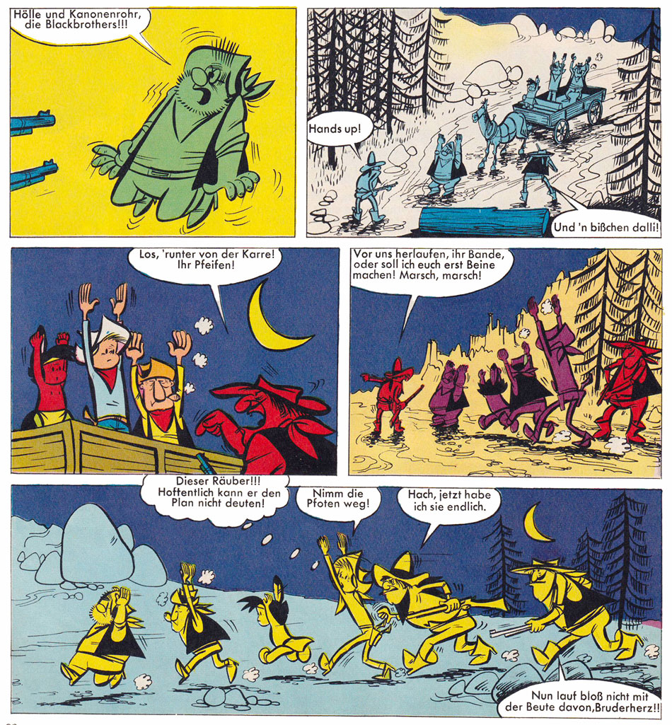 In 1966-1967, M. Becker also drew two serials of Rolf Kauka's western series 'Tom und Klein Biberherz' in Fix und Foxi magazine. Her serials, '...und es pfeifen die Pistolen' (issues #571-575) and 'Sieg in Whisky-Town' (issues #609-613), appeared in alternation with serials by the comic's regular artist, Vlado Magdic. Together with Maria Luisa Uggetti and Sieglinde Sander, the mysterious "Frau Becker" was one of the few female artists working for Rolf Kauka during the early period. She was however not the Becker in another mysterious Kauka creator team, the duo Becker-Kasch.