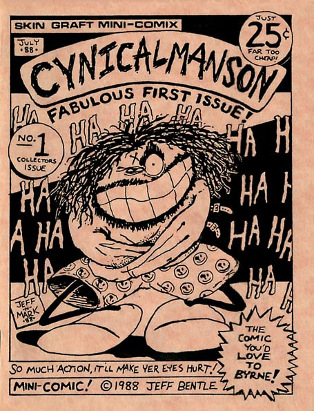 In 1988, Jeff Bentle was one of the early cartoonists joining high school students Mark Fischer and Rob Syers in the creation of their DIY mini-comics. Based in St. Charles, Missouri, SKiN GRAFT Comix released self-published comic zines inspired by the punk movement. Besides their flagship zine SKiN GRAFT Comix, they also released independent mini-comics based on one or more characters. Jeff Bentle, probably a school friend, worked with Mark Fischer on three issues of 'Cynical-Manson', a parody on Charles Manson.