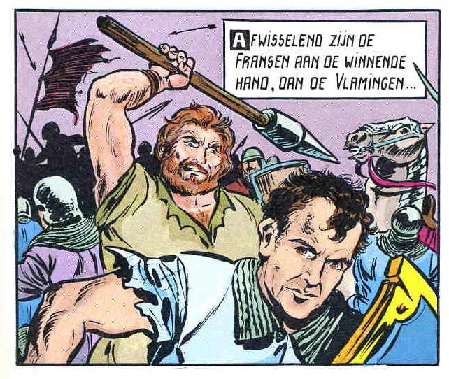 While 'De Rode Ridder' was dramatic in tone, Biddeloo was well-known for not taking things too seriously. He loved giving certain celebrities a cameo for fun, like the previously mentioned movie stars and colleague Marc Sleen. In 'De Heren van Rode', he gave notorious quack doctor Herman Le Compte a small role, while Albert Einstein appeared as Dr. Alberstein in 'De Zwarte Toren' (1987). In 'De Leeuw van Vlaanderen' (1983), the artist even indulged in a rare bit of political satire when one of the French knights attacked by Flemish peasants happens to be a caricature of José Happart, then-major of Voeren/Fourons, who was controversial for his refusal to learn Dutch, despite Belgian language laws. Some side characters in 'De Rode Ridder' are played for laughs, like the bickering alchemists Jork and Muulsh in 'De Verrader van Yarkand' (1975), 'De Ster van Het Oosten' (1976) and 'De Scharlaken Brigade' (1982). In 'De Galeislaaf' (1977), Storkas the barbarian and his tall tales about his "adventures" are another example of Biddeloo's comedic side. A running gag is the self-important and loud-mouthed Yacki (also spelled as "Jakke", "Yakki", "Jacqui", "Shaky" and "Dzaky"). This ridiculous little bragger reappeared in several albums from 'Xanador' (1981) on, and was based on a teacher Biddeloo used to know. Some of the short 'Rode Ridder' stories Biddeloo made for special occasions are also deliberately silly. As a joke, Marc Sleen and Hec Leemans once drew a couple of characters on page 18 of 'Het Dievengilde' (1980). The break in style might have been noticed by some readers, but certainly not everybody.