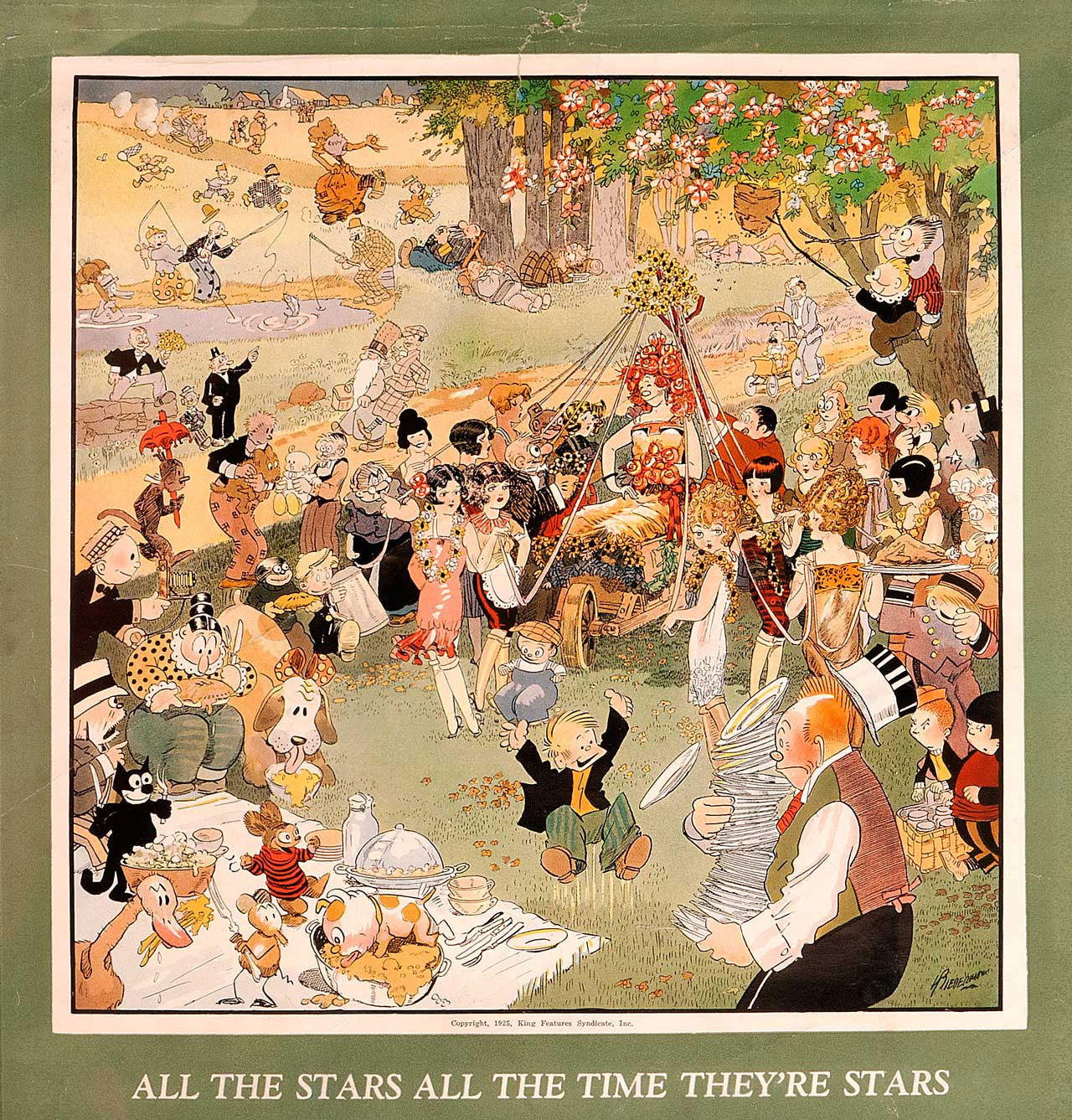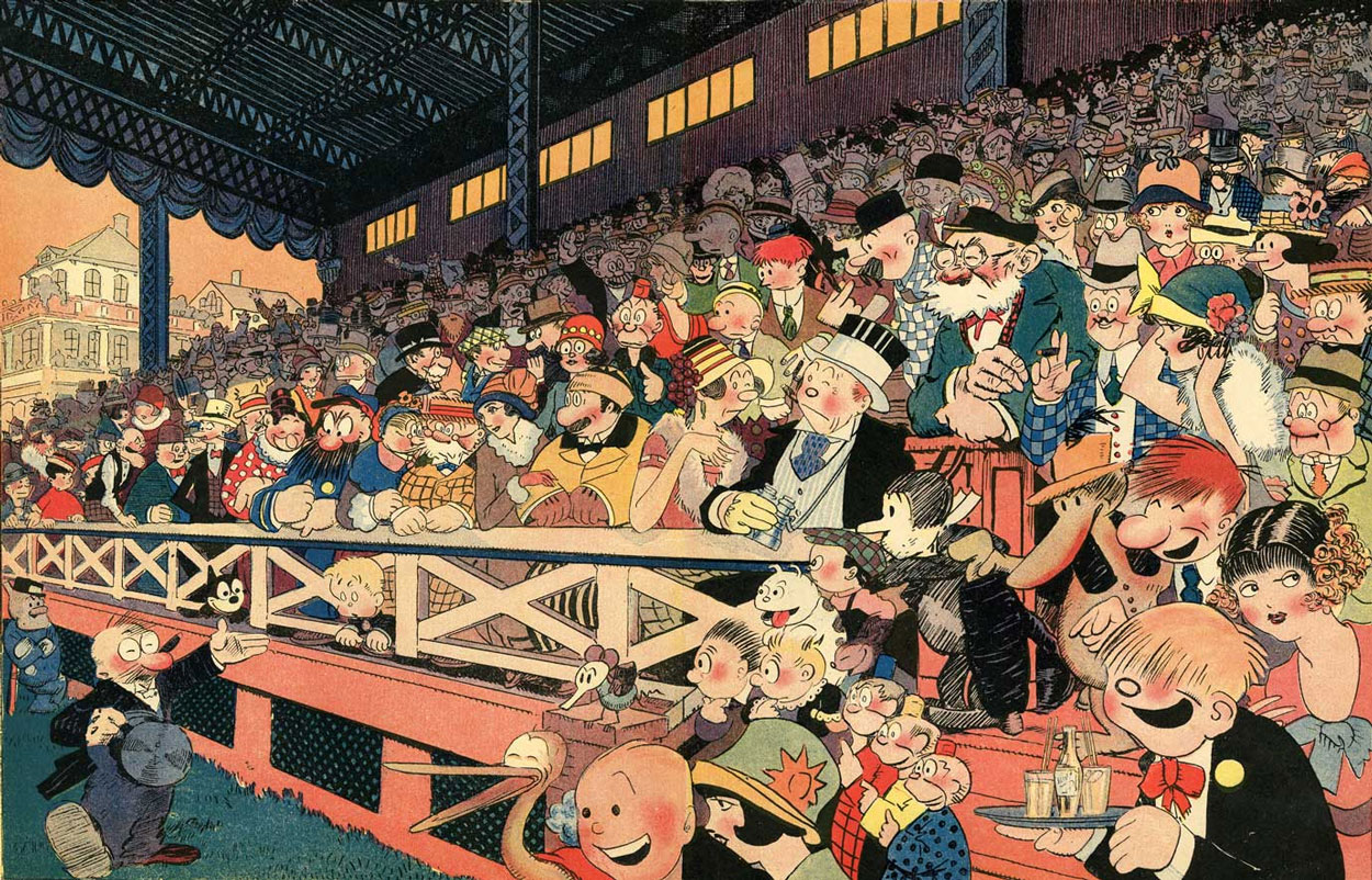 In the mid-1920s, Hollywood scriptwriter Jack Lait wrote the children's book 'All The Funny Folks: The Wonder Tale of How the Comic-Strip Characters Live and Love "Behind the Scenes"' (The World Today, Inc.,1926). The book is notable for featuring dozens of famous U.S. newspaper comic characters, created by different cartoonists for different papers and syndicates. The story, written in rhyme, describes how all the cartoon characters live together in a magical land. On first glance, it looks as if each cartoon character (Felix the Cat, The Katzenjammer Kids, Ignatz Mouse, etc.) was drawn by the original artist. However, in the 1920s, this would have taken far too much time. It was considerably easier and cheaper to have one talented illustrator draw all these characters on his own. Biederman's previous job - filling in for vacationing cartoonists - had developed his skill at being able to copy any of the cartoonists at King Features. He was therefore selected to illustrate 'All the Funny Folks' and mimicked the graphic styles of all these artists extraordinarily well. He showed comic characters not only in close-up vignettes, but also in panoramic crowd scenes - at the races, a wedding ceremony, a banquet, and other locations. Biedermann's attention to detail is remarkable. Thanks to his mastery of perspective and proportion, he gives everything a high degree of believability.
