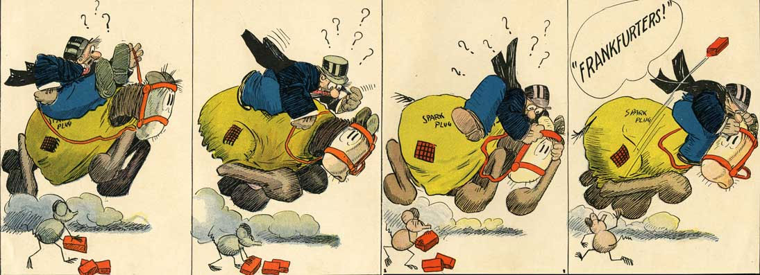Louis Biedermann's version of Billy DeBeck's Barney Google riding Spark Plug, with George Herriman's Ignatz the Mouse hurling a brick, from 'All The Funny Folks' (1926).