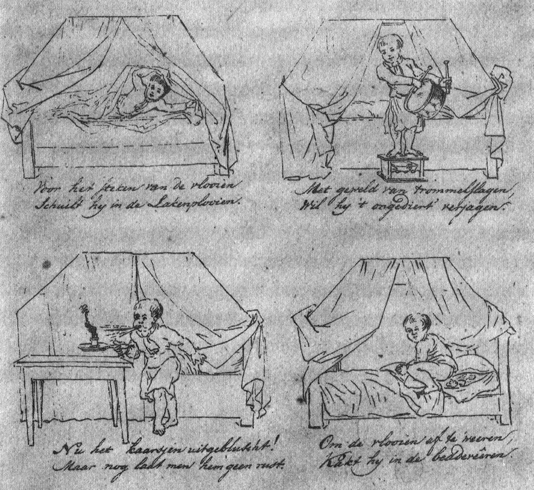 In 1807, Bilderdijk wrote a little picture book for his toddler son Julius Willem (who would die in 1819 at age 21 on board of a merchant ship). The work was titled 'Hanenpoot' (literally: "Rooster paw", but it can also allude to "badly decipherable writing"). Bilderdijk and his wife used to read it to Julius as a bedtime story. The eight-page book stars a little boy, Hanenpoot, who is described as a "smart fellow". The kid is indeed quite crafty. He uses his bare behind for a variety of acts, including roasting a piece of bread. In another storyline, he manages to fend off fleas. 'Hanenpoot' is interesting because it features a series of sequential images with handwritten sentences underneath it. This makes Bilderdijk one of the earliest Dutch comic pioneers, along with Hieronymus Bosch, Pieter Bruegel the Elder, Otto van Veen and Romeyn de Hooghe. Together with de Hooghe's cartoons, 'Hanenpoot' is the earliest Dutch text comic with a signature. Bilderdijk also goes down in history as the first celebrity cartoonist who wasn't known as a graphic artist. Yet in his own lifetime, nobody outside his family was aware of the book's existence. He only intended it for private use.