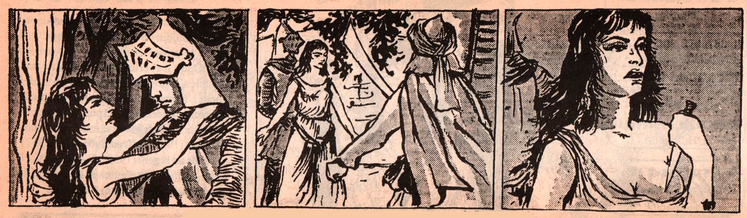Bloch drew additional serialized newspaper picture stories for L'Humanité's Sunday paper, L'Humanité Dimanche, mostly in the vertical text comics format. These included an adaptation of the Honoré de Balzac play 'Splendeur et Misère des Courtisanes' (1956), a serial about the life of French 19th-century dramatist and poet Alfred de Musset (1957) and comic strip versions of the Alexandre Dumas novels 'Une Fille du Régent' (1957-1958) and 'Le Bâtard de Mauléon' (1959). Another productive comic artist for L'Humanité during this period was Pierre Donga.