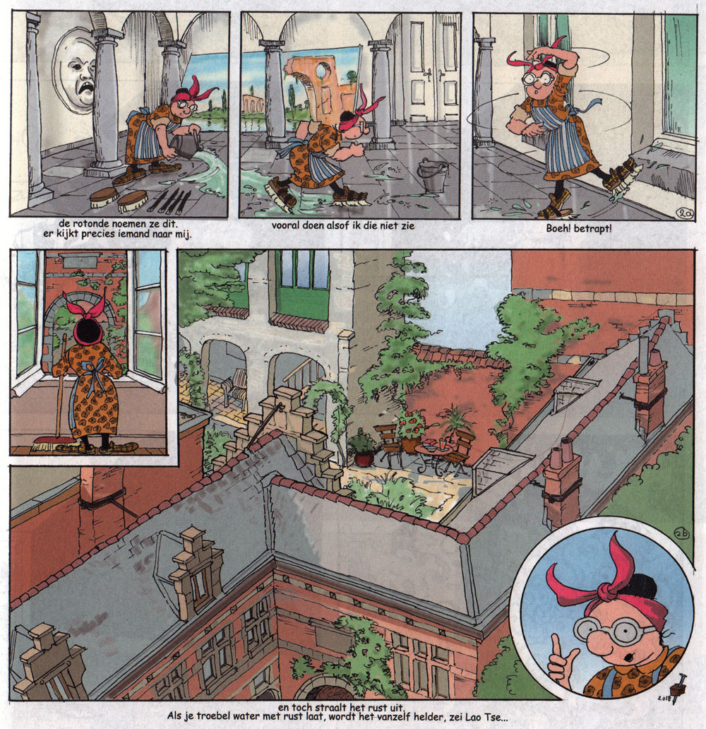 ERCOLA also produced cover illustrations for Real Free Press Illustratie, a publication of underground comix publisher Olaf Stoop from Amsterdam, who also imported Spruit in The Netherlands. Their collective comic productions additionally appeared in publications like Aloha ('Johnny Kwatta & Sinister Agens'), Impact International, Jos Vanhamme's Ding, Mimo, Tarantula, Gargl and Diepdruk. As a group, they also participated in contests, winning third place with their work 'Beethoven en de Visser' in a contest organized by the Socerlid society from Paris, France. In 1972, the group made the collective book 'De Ont(h)aarde Maagd', together with writer/poet Marcel van Maele. The artwork was provided by Block, Buytaert, Carlens and Goelen. In their collective productions, Buytaert was mostly responsible for the background art, Block for the characters and Carlens for the inking.