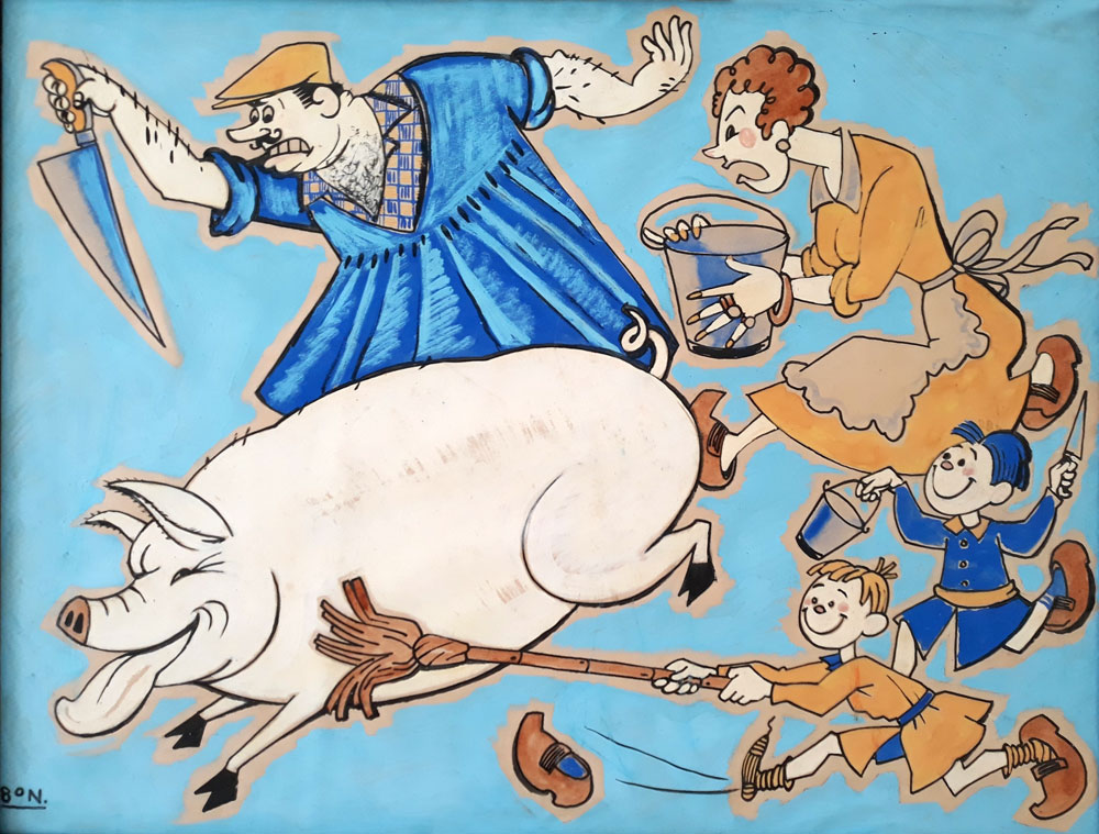 Romà Bonet Sintes, who signed his work with the pseudonym Bon, was a Catalan artist with a prolific output, gaining international recognition in the early 20th century. He made cartoons for magazines and newspapers, designed posters and book covers, and traveled the country with his trailer, making caricatures-on-demand and performing as a live cartoonist. A strong supporter of the Republican cause, his prominence diminished after the Spanish Civil War of 1936-1939. He spent his final years making portraits, sculptings and oil paintings.