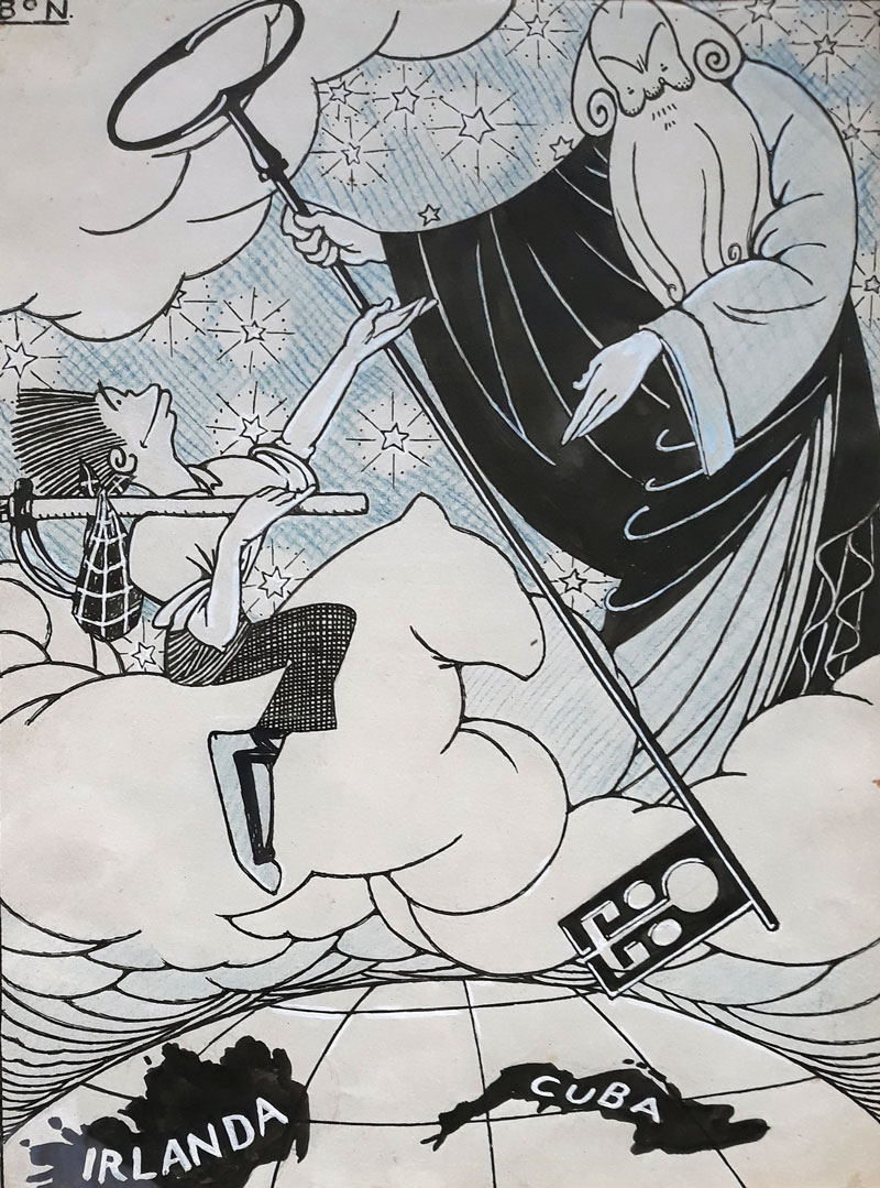 Additionally, Bon designed advertising posters, several of which won prizes in industrial competitions. Four of his posters were awarded at the 1925 International Exhibition of Decorative Arts in Paris, France. His international reputation rose even further during the 1925-1926 conferences of the League of Nations in Geneva, when his caricatures of the political representatives were printed in newspapers across the globe. In 1927, Bon was appointed representative of the Union of Spanish Cartoonists during a four-month residency in New York City, where he organized exhibitions of Spanish cartoon art. During his New York period, he also produced artwork for the newspapers New York Herald Tribune, the New York Times, World Traveler, Evening Post, the Morning Telegraph, Moving Pictures World and appeared in magazines such as Cosmopolitan and Vanity Fair.