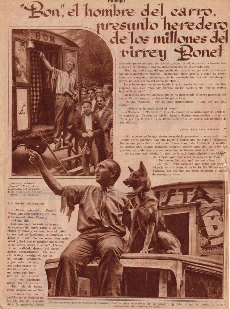 At the end of the 1920s, Bon settled in a trailer at the International Exposition of Barcelona (1929-1930), making caricatures of about 8,000 visitors. After the exposition, the popular artist took his trailer on tours through Spain and Gibraltar, working as a caricaturist-for-hire and organizing expositions in several towns. Local newspapers and magazines regularly reported about the arrival of the nomadic artist with his wagon, dog and canary, describing him as a "minstrel" and "a strange type of artist and bohemian", while praising his "magnificent outfit": a lemon-colored silk dressing gown with a colossal collar. Between 1930 and 1936, Bon also entertained young audiences with his "Silent Conferences", eloquent and humorous shows with live drawings.