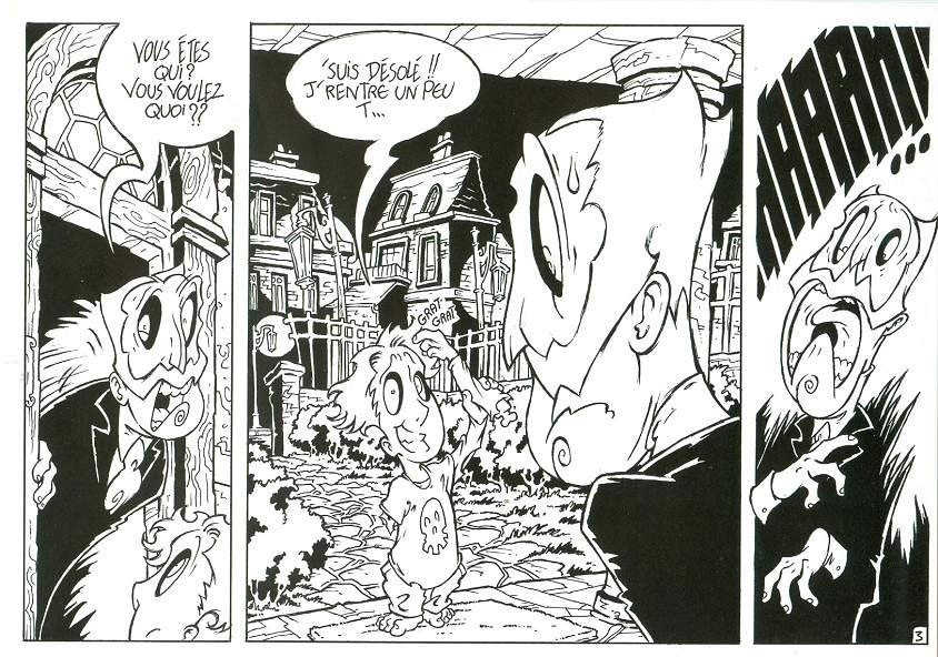 At one point, Bouyer left a couple of his pages at the Atelier Sanzot, an artists' studio in Angoulême. Sanzot's Éric Derian brought him in contact with the scriptwriter Emmanuel Lepage (AKA "Angus", born in 1973), who should not to be confused with the comic artist of the same name: Emmanuel LePage (born in 1966). After working on a test script together in 1997, Angus agreed to write a story with the character of Larry, one of Bouyer's creations from a couple of years earlier. He became one of the main cast members in the humorous children's series 'Les Kids Halloween', about a group of zombie children. In 2000 and 2001, two books were published by Triskel.