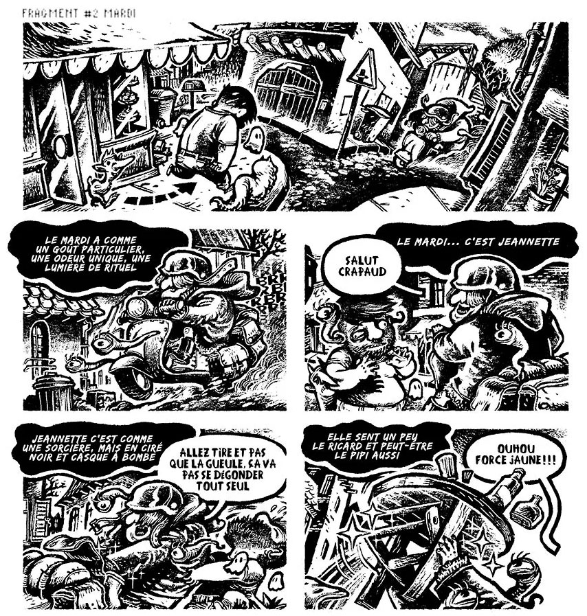 Loïc Bouyer returned to the local art scene of La Rochelle, where he has been involved in organizing cultural events like Poids Plume and Dessins Au Jardin de Plop. Under names like Loïc Eulchien and LeHoundd, he has been creating autobiographical DIY fanzines through his imprint Le Bureau Provisiore, several of which are also available on the Grandpapier platform. Among his fully handicrafted titles have been the mini booklet series 'Tâche de Plomb' (2019), the semi-autobiographical adventure series 'Le Z.A.C.' (2019- ) and 'Canis Corpus' (2024).
