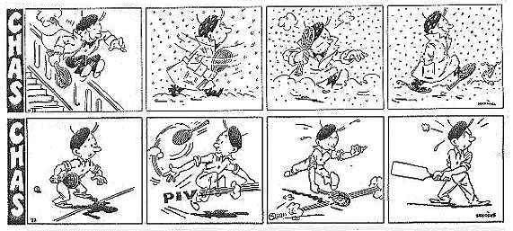 Bramming's pantomime comic strip 'Frederik' (1946-1948) appeared in FRI, the "magazine for girls and boys" from its first issue in April 1946. From the following year on, Bramming was employed by the publishing house of the daily newspaper Politiken. He made sports cartoons for the paper until the 1960s, and provided illustrations to the publisher's 'Hvem Hvad Hvor' annuals (1948-1951), which gave an overview of the major news events. He also made the illustrations for Paul W. Svendsen's book about soccer rules, 'Var der Frispark' (Politikens Forlag, 1949). From 1949 to 1956, Bramming was one of the regular artists for Idrætsbladet, Politiken's separate sports weekly. Besides cartoons and illustrations, Bramming also made the pantomime comic about sports photographer 'Chas' (1950-1952), who also served as a sort of mascot for the magazine. In 1952, he made 'Sporty & Søn', a promotional comic strip starring a father and son, about the virtues of sports. The strip had captions in rhyme written underneath the images.
