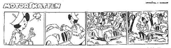 Bramming was additionally present in Motorjournalen with the comic strip 'Motorskatten' (1954), about an inventive young lady and her small sports car. The plots were written in cooperation with journalist Wilhelm Grandt. He also made many humorous drawings for collection books published by the Danmarks coffee surrogate factory. He turned freelance in 1956, and spent the next decades working for magazines like Familie-Journalen and Toldtidende.